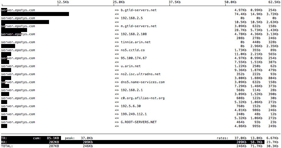 La pantalla que se presenta es muy fácil de entender, en la parte superior tenemos la medida del tráfico utilizado por los servidores y equipos listados en la parte inferior, donde veras el nombre o la IP del equipo que esta generando o recibiendo las solicitudes, adicionalmente al final de la pantalla encontrarás un resumen del consumo total de datos de salida y entrada.